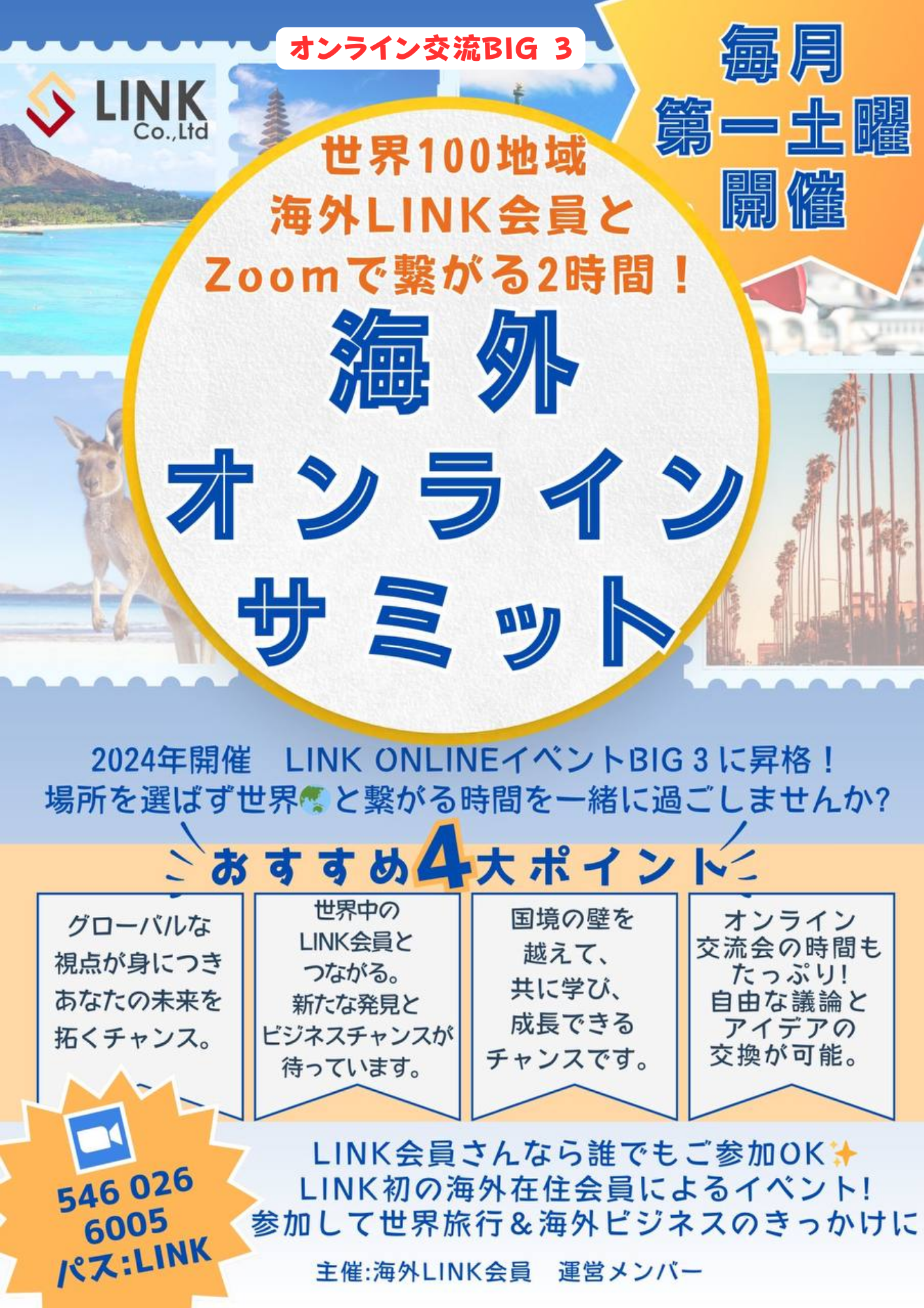 LINKセミナー/LINK公式イベント LINKを理解し、宝の地図を手にいれる! 1 LINKセミナーに参加(5種類) LINKセミナー大橋社長編 LINKを完全理解出来る場所 LINKセミナー特別編 【グループ構築】特化版 LINKセミナー特別編 【自己ブランディング】特化版 LINKセミナー特別編 【新サービス特化版】 2 LINK公式イベント『リアルBIG 3』 ▶︎ LINKセレモニー▶︎ ウィークエンドセミナー▶︎ LINKオリエンテーション(夏・冬) 3 LINK公式イベント『オンラインBIG 3』 ▶︎ つなぐマルシェ in オンライン▶︎ オンライン全国メンバーズ交流会▶︎ 海外オンラインサミット LINK公式イベント『リアルBIG 3』 LINK公式イベント『オンラインBIG 3』 TOP
